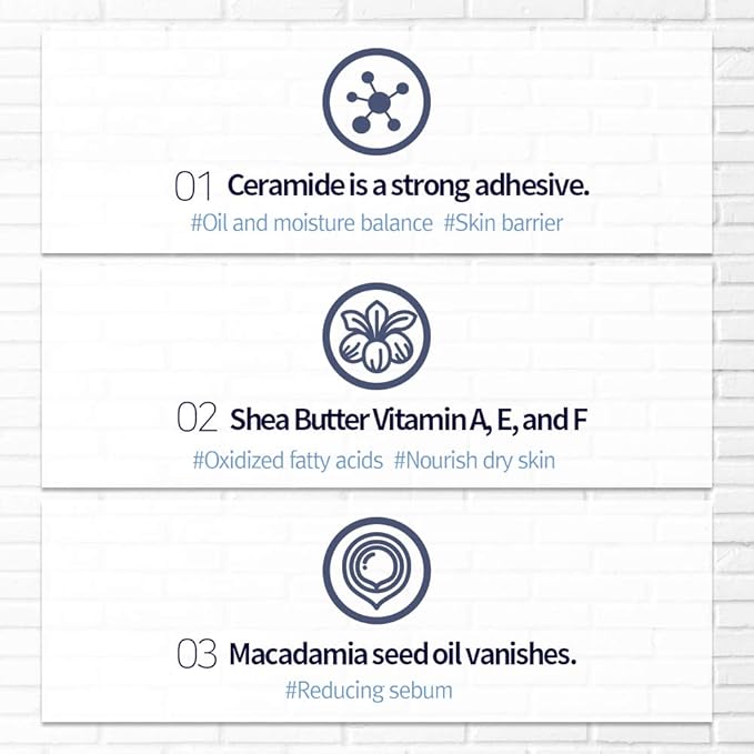- 3-LAYER SKIN BARRIER - Ceramide in the cream plays the role of mortar which prevents moisture evaporation, adjusting oil and moisture balance properly while reinforcing an imbalanced skin barrier. Moreover, Shea Butter and Macadamia seed oil nurishes dry skin and reduce sebum resulting from aging skin.