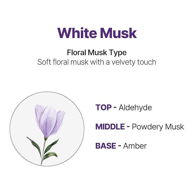 - WHITE MUSK: Experience the timeless allure of White Musk, a soft, powdery scent that exudes elegance and tranquility for everyday wear.