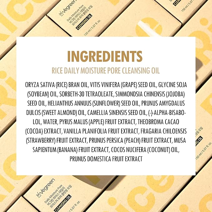 - GENTLE CLEANSING ELIXIR. VEGREEN Rice Daily Moisture Pore Cleansing Oil is a lightweight face cleansing oil that harnesses the power of Rice Bran, Grape Seed, and Jojoba Oils to dissolve makeup and impurities. Its delicate watery consistency ensures a deep cleanse without leaving any residue.