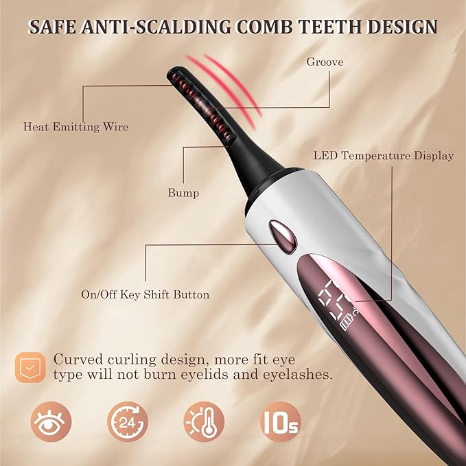 - 【Careful Design and Safety Protection】This electric eyelash curler is easy to operate. The 15°arc brush head fits your lashes better, temperature memeory function, can directly display the temperature set in the last use. The lash curler with 5 minutes no-operation auto-break, anti-misoperation, heat insulation protection comb.he thermal insulating protection slots can avoid heat contacting the eyelid.